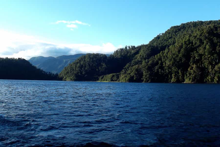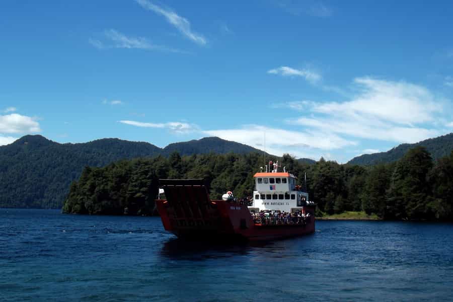 Durante el viaje nos fuimos en la parte exterior de la barcaza, donde uno puede mirar el paisaje tranquilamente apoyado en sus barreras de metal. Lo primero que se ve al partir es el volcán Mocho Choshuenco (llamado así por su forma “ñata”, como si le hubieran pegado un combo a su cono), pero pronto queda atrás, entre los islotes llenos de árboles y roqueríos. Es una hora y media de contemplación, en la que sus cámaras van a quedar cortas de batería.