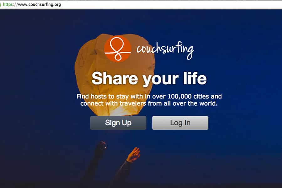 Couchsurfing es una red social de viajeros, en donde uno puede buscar y/o ofrecer un “sillón” para alojar a quienes recorren el mundo. El sillón que se ofrece en ocasiones es una habitación de huéspedes toda amoblada o puede ser también, literalmente, un sillón. La verdad es que es una muy buena opción para quienes viajan con poco dinero y necesitan donde pasar la noche y para quienes quieran conocer personas del lugar donde viajan.