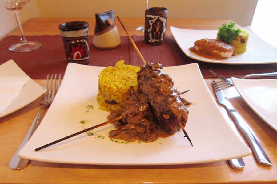 Plato: Brochetas de cordero (Lamb brochettes) de Restorán Afrigonia. Imagen CC. Miguel Vieira