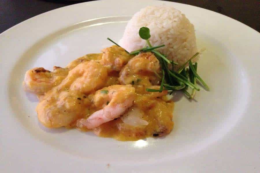 Plato: Camarones andinos, salsa finas hierbas y queso de cabra con arroz de Giratorio Restorán (giratorio.cl). Imagen CC. Elias Roviero