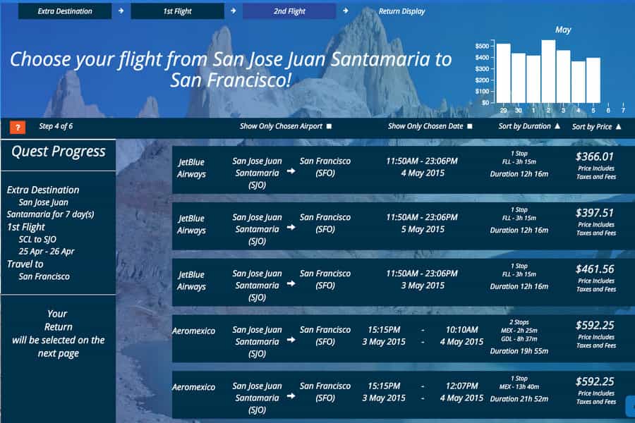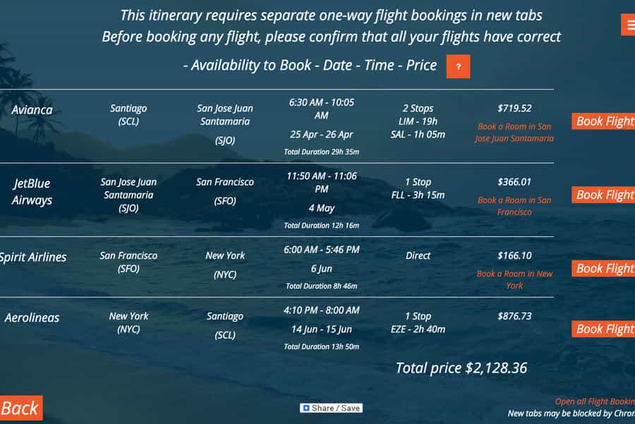 Les dejo como ejemplo una búsqueda que parte desde Santiago, Chile, para en San José para continuar hasta San Francisco, California. Luego pasando por Nueva York, volvemos a SCL. El precio total es de USD$2,128.36 un precio bastante atractivo para un viaje muy interesante. Recuerden buscar precios alternativos con otras aplicaciones antes de decidir con quien bookear.