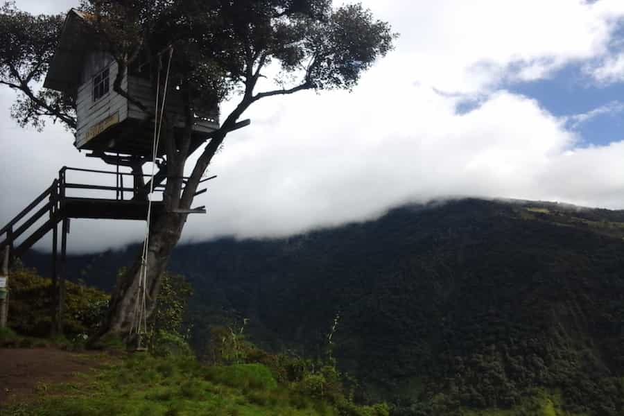 Otra ruta que puedes hacer en bicicleta o caminando es "La Casa en el árbol", que queda a la salida de la ciudad y para llegar a ella debes subir un largo camino, pero al encontrarla podrás columpiarte como un niño, ya que de ésta cuelga un columpio el que te lanza al vacio (tiene broches de seguridad), sintiendo adrenalina, viendo un lindo paisaje, incluyendo al Volcán Tungurahua de lejos.