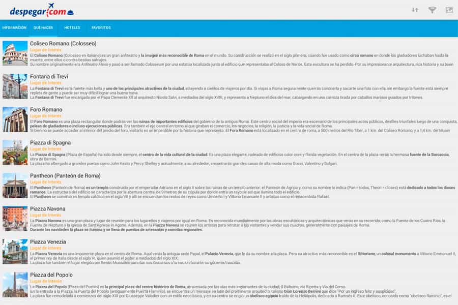 1. Guía turística - Despegar.com: por más que hayas visto mapas, videos o fotografías para definir tus destinos imperdibles, descargar esta guía en tu móvil te será de gran utilidad. A través de ella podrás leer una breve historia de Roma, revisar algunas sugerencias de visitas, conocer modalidades de transporte, etcétera.