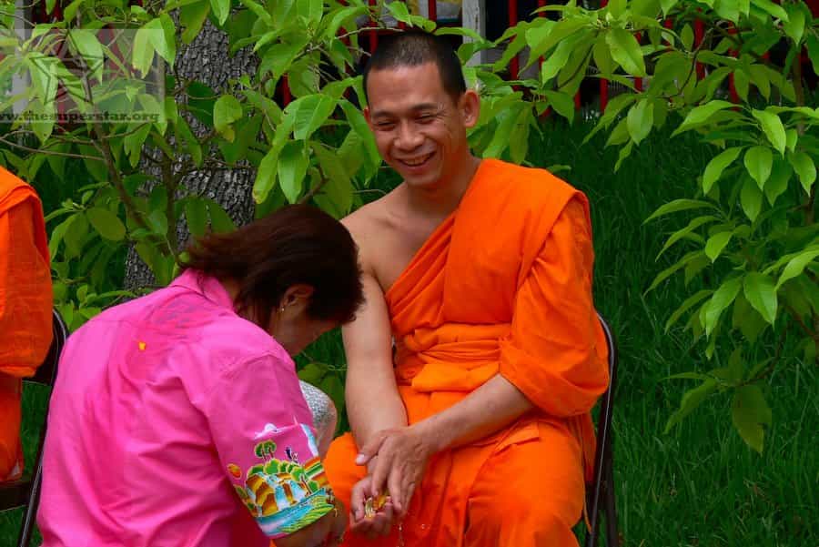 Caminando por las calles, también puedes recibir un puñado de tiza. Esto viene de la tradición de los monjes , quienes marcaban las bendiciones utilizando tiza. La combinación de tiza y agua es muy parecida a Holi.
