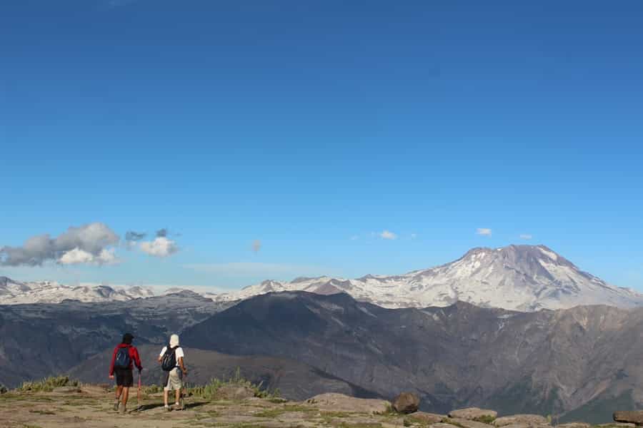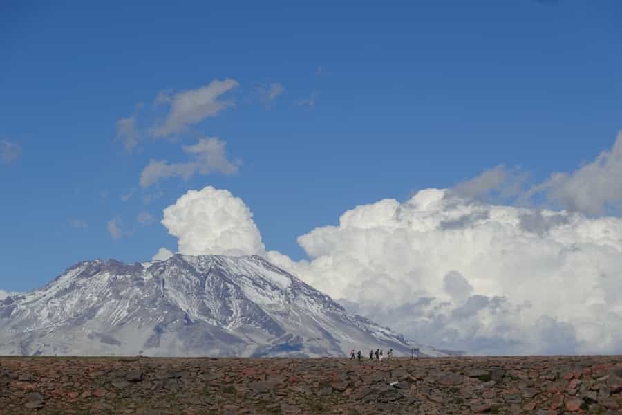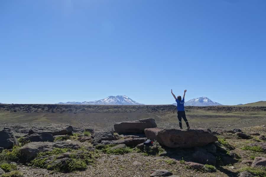 Sobre la plataforma, hacia el fondo, se ve el gran volcán Descabezado Grande y su acompañante eterno, el Cerro Azul, que alberga al volcán Quizapú en un costado. Una postal de maravilla que no se salvó de nuestras cámaras fotográficas ni de las de otros grupos que andaban esos días. Últimamente este se ha convertido en un destino bastante popular.