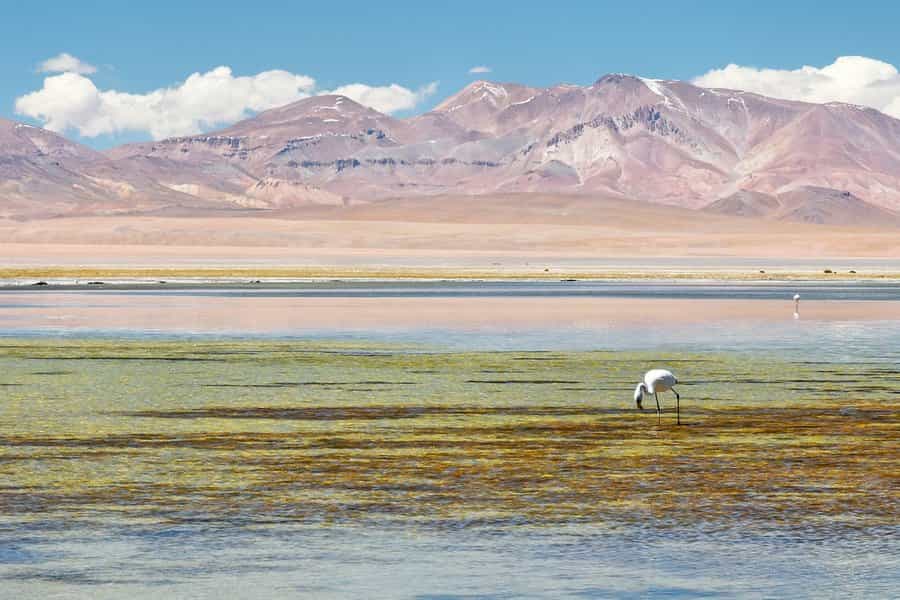 Montañas con picos nevados y coloridos flamencos marcan el paisaje del Salar de Atacama. Situadas en medio de los Andes y rodeadas de volcanes activos, la sensación de infinitud y pequeñez son difíciles de explicar. Aguas turquesa que reflejan un cielo cercano y sin fin terminan de marcar este paisaje hogar de la fauna nativa.