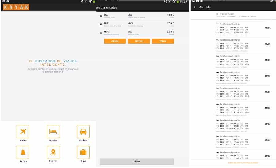 Kayak es un buscador de vuelos baratos que también sirve para encontrar hotel. Sin embargo, la he puesto en la lista porque tiene una particularidad: es el mejor sitio para encontrar vuelos combinados, o múltiples trayectos, a los mejores precios. Es decir, si quieres viajar a un lugar y desde allí volar a un segundo destino, muy recomendable para personas que quieran conocer más de un lugar en un mismo viaje. La aplicación funciona correctamente, es muy confiable y permite realizar los pagos con tarjeta de crédito de manera muy expedita.