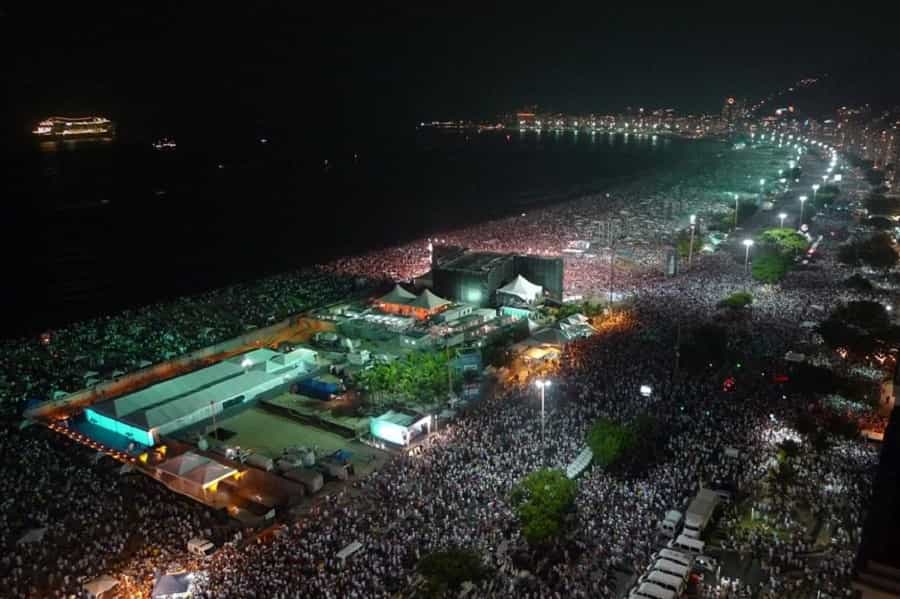 La playa de Copacabana se transforma en un mar blanco en esta ocasión. Más de 2 millones de personas se juntan a celebrar vestidos de blanco Reveillon, una celebración típica de Brasil que mezcla las antiguas tradiciones con las nuevas celebraciones. El espectáculo incluye fuegos artificiales y música en vivo.