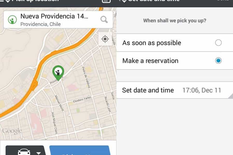 Con la aplicación de Cabify puedes decidir ser geolocalizado o poner la dirección en la que quieres ser recogido. Puedes incluso pedir un vehículo para recoger a otra persona. También puedes pedir ser recogido a una hora posterior. Ideal si vas a una fiesta y quieres tener un auto esperándote a la puerta. Al bookear tu auto recibirás la información del chofer y auto en el que viajarás. Recuerda que Cabify usa su flota y choferes a quienes seleccionan.